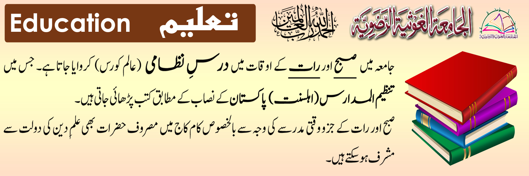 The main purpose of Jamia is to educate Muslims, DARS E NIZAMI (Aaalim Course). In addition of this, Jamia also conducted other courses like ARABIC SPEAKING COURSE, COMPUTER COURSES (Special course to educate Islamic Students and Ulama use of computers for writing Fatawas, Books etc).